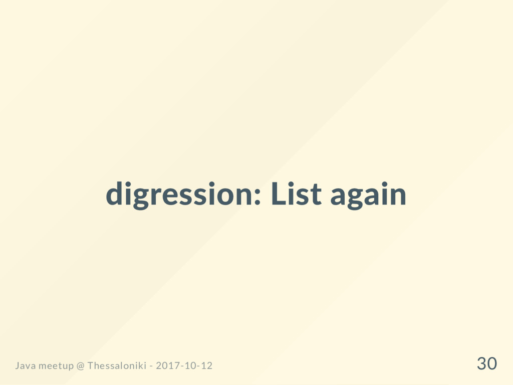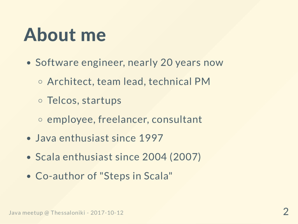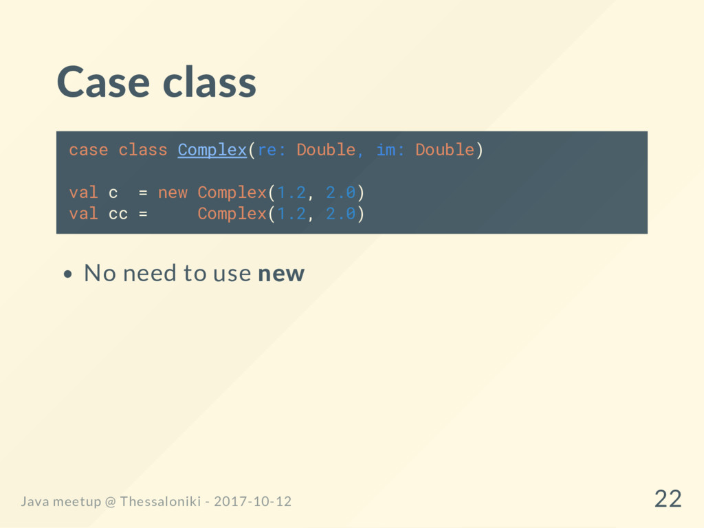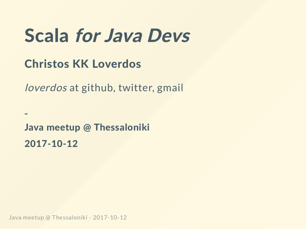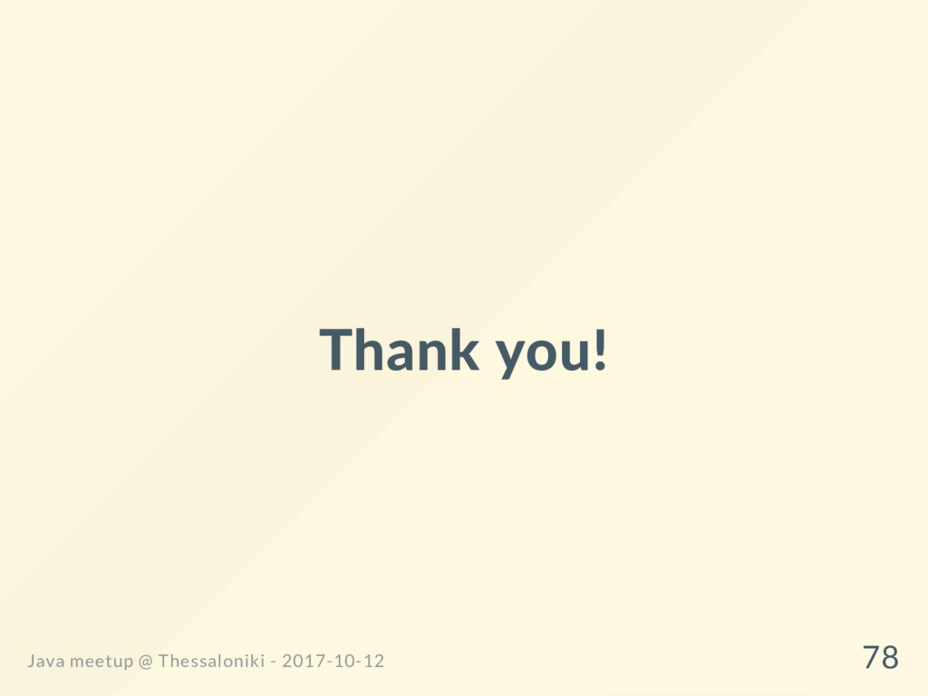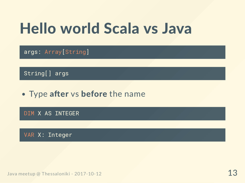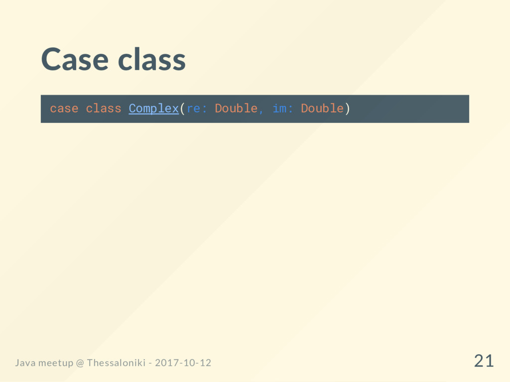 and Maps scalal> val list = List(1, 2, 3) list: List[Int] = List(1, 2, 3) scala> val isOdd = (x: Int) => x % 2 == 1 isOdd: Int => Boolean = <function> scala> val oddeven = list.groupBy(isOdd) oddeven: scala.collection.immutable.Map[Boolean,List[Int]] = Map(false -> List(2), true -> List(1, 3)) Java meetup @ Thessaloniki - 2017-10-12 50