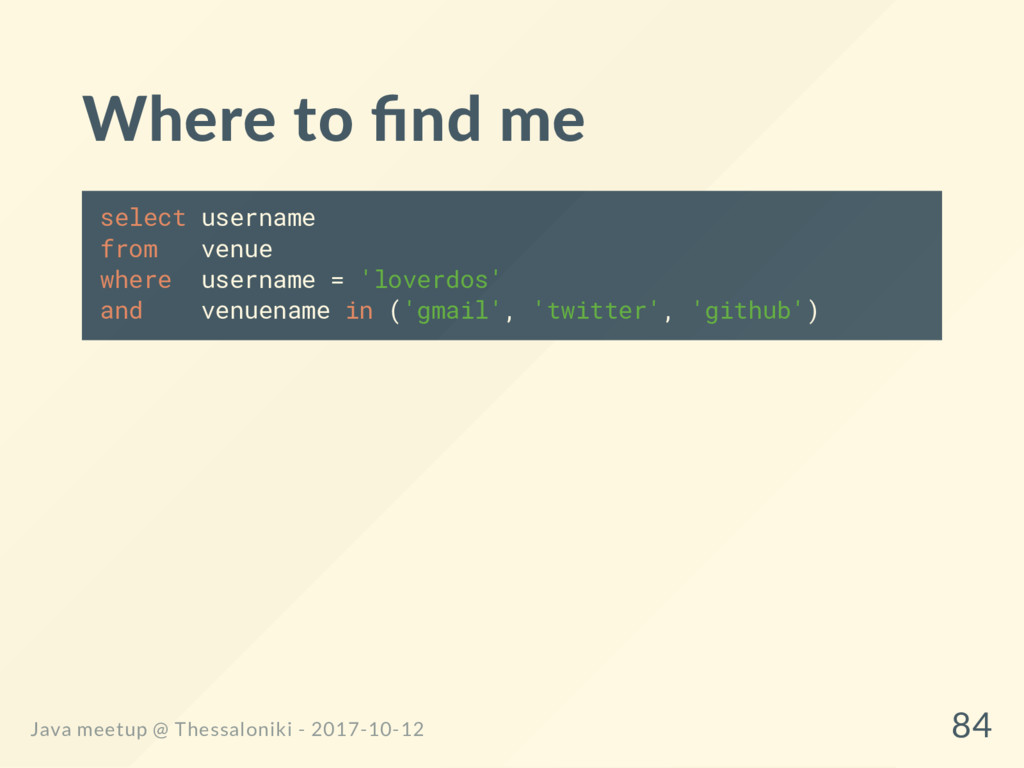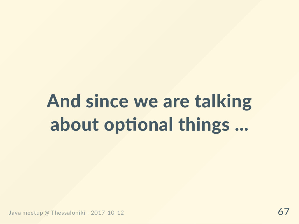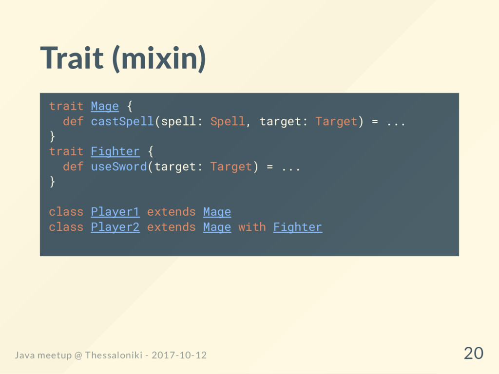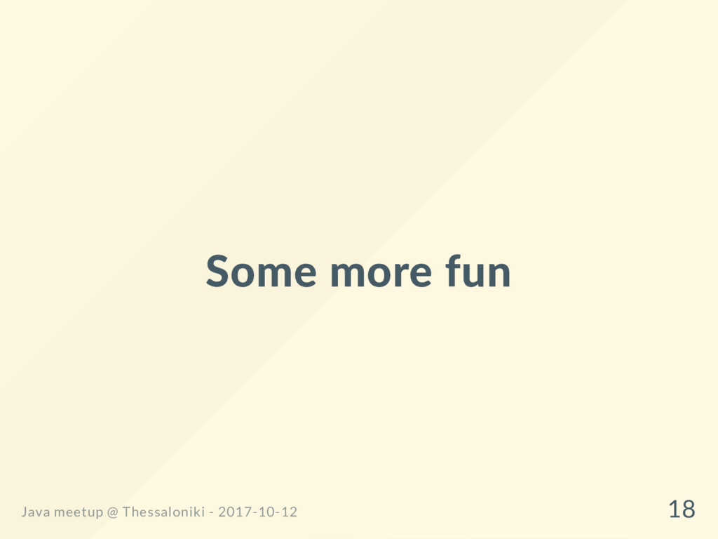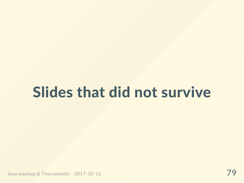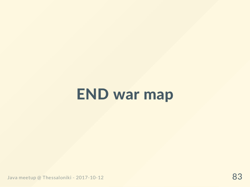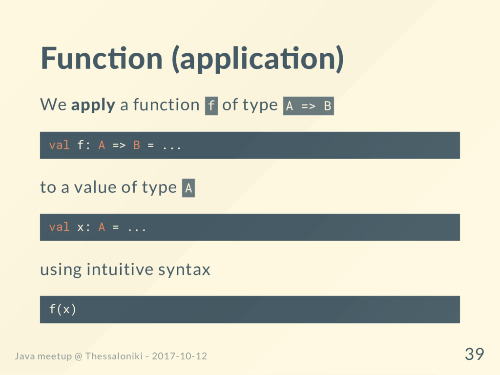 and Maps scalal> val list = List(1, 2, 3) list: List[Int] = List(1, 2, 3) scala> val isOdd = (x: Int) => x % 2 == 1 isOdd: Int => Boolean = <function> scala> val oddeven = list.groupBy(isOdd) oddeven: scala.collection.immutable.Map[Boolean,List[Int]] = Map(false -> List(2), true -> List(1, 3)) Java meetup @ Thessaloniki - 2017-10-12 50