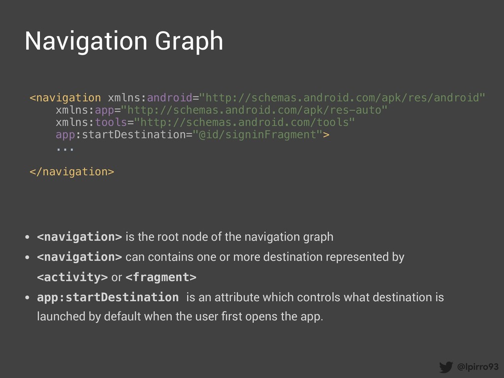 <navigation> is the root node of the navigation graph • <navigation> can contains one or more destination represented by <activity> or <fragment> • app:startDestination is an attribute which controls what destination is launched by default when the user first opens the app.