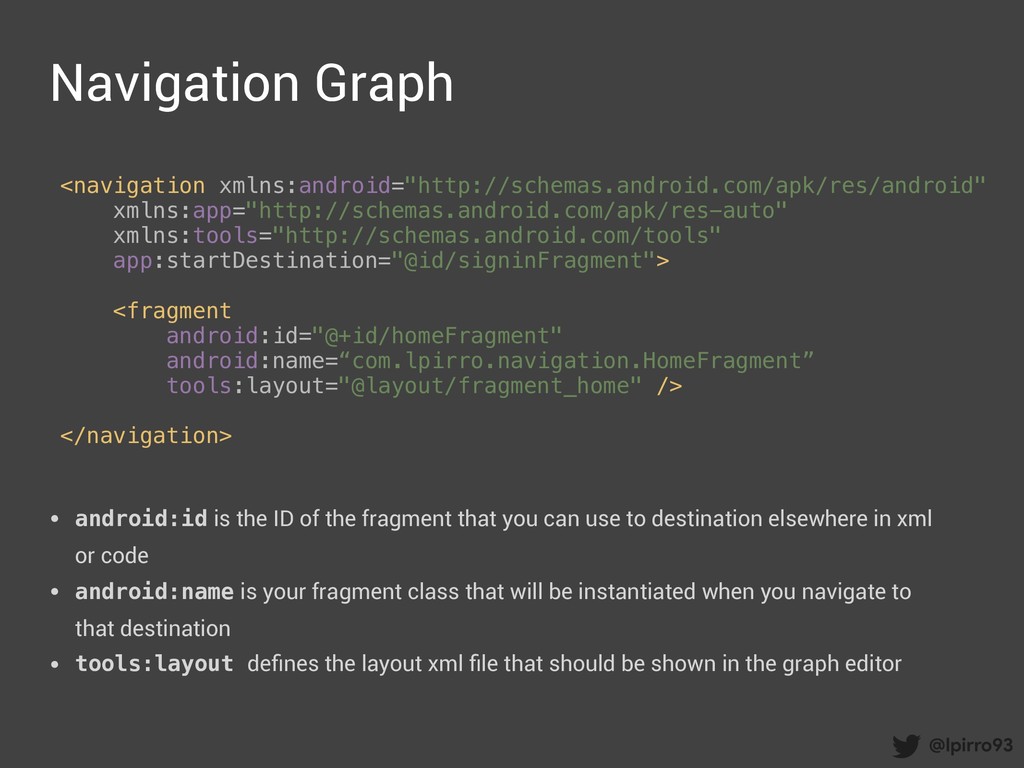 tools:layout="@layout/fragment_home" /> </navigation> • android:id is the ID of the fragment that you can use to destination elsewhere in xml or code • android:name is your fragment class that will be instantiated when you navigate to that destination • tools:layout defines the layout xml file that should be shown in the graph editor