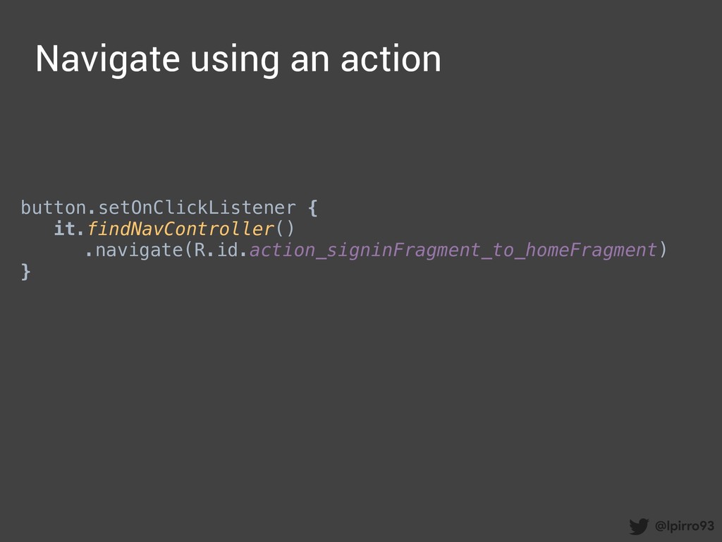 android:name=“androidx.navigation.fragment.NavHostFragment" ... /> <android.support.design.widget.BottomNavigationView android:id="@+id/bottomNavigationView" app:menu="@menu/bottom_navigation_main" /> </android.support.constraint.ConstraintLayout> Uses the same IDs of the destinations defined in the Navigation Graph res/layout/activity_main.xml KF