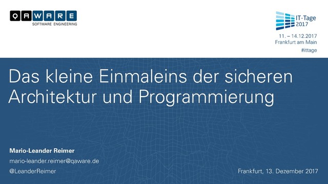 Sicherheit ist leider immer noch eine allzu häufig vernachlässigte nicht-funktionale Eigenschaft heutiger IT-Systeme. Unsere Auftraggeber haben oft die implizite Erwartung an ein sicheres System; als Entwickler bauen wir genau das was gefordert wurde. Mit manchmal unangenehmen Konsequenzen. Das Nachrüsten von Sicherheit in ein bestehendes System ist arbeitsintensiv, zeitaufwändig und teuer. Einfacher ist es, die Sicherheit bereits vom ersten Tag an mit zu berücksichtigen. Hört sich schwierig an? Ist es aber nicht. Dieser Vortrag präsentiert einfache Regeln, Tools, Technologien und Entwurfsmuster die ein sicherer Entwickler und Architekt definitiv kennen sollte.