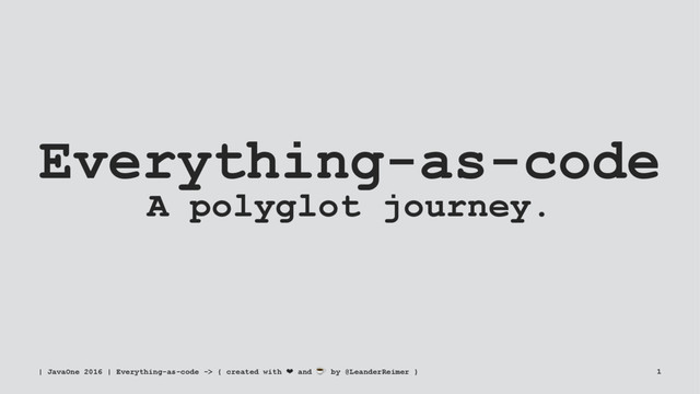 As modern, agile developers we love to master several different languages all at once to be 100% productive. We define our development environments using Gradle. We implement our software in Java, Kotlin or another JVM based language. We use Groovy or Scala to test our code at different layers. We construct the build pipelines for our software using a Groovy DSL or JSON. We use YAML and Python to describe the infrastructure and the deployment for our applications. We document our architectures using AsciiDoc and JRuby. Welcome to Babel! Making the right choice in this multitude of available languages is not easy. This code intense, polyglot session is an opinionated journey into the modern era of software industrialization. The session has been presented at the #JavaOne 2016 conference. (c) @LeanderReimer @qaware