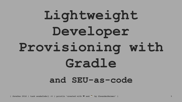 Every software project starts with the setup of a local development environment: a JDK, a preferred IDE and build tool, a local database and application server and so forth. Everything you and your team needs to be productive from day one. Time is valuable, so you take the quick route and reuse a development environment from a previous project. Broken windows from day one! With the first required changes things usually start to go wrong, the individual environments start to diverge and problems during the build or local execution of your software are inevitable. So how can you do better? The short answer is: with SEU-as-code, a lightweight approach and tool based on Gradle that helps to alleviate and automate the provisioning of developers. This session has been presented at the #JavaOne 2016 conference. (c) @LeanderReimer @qaware