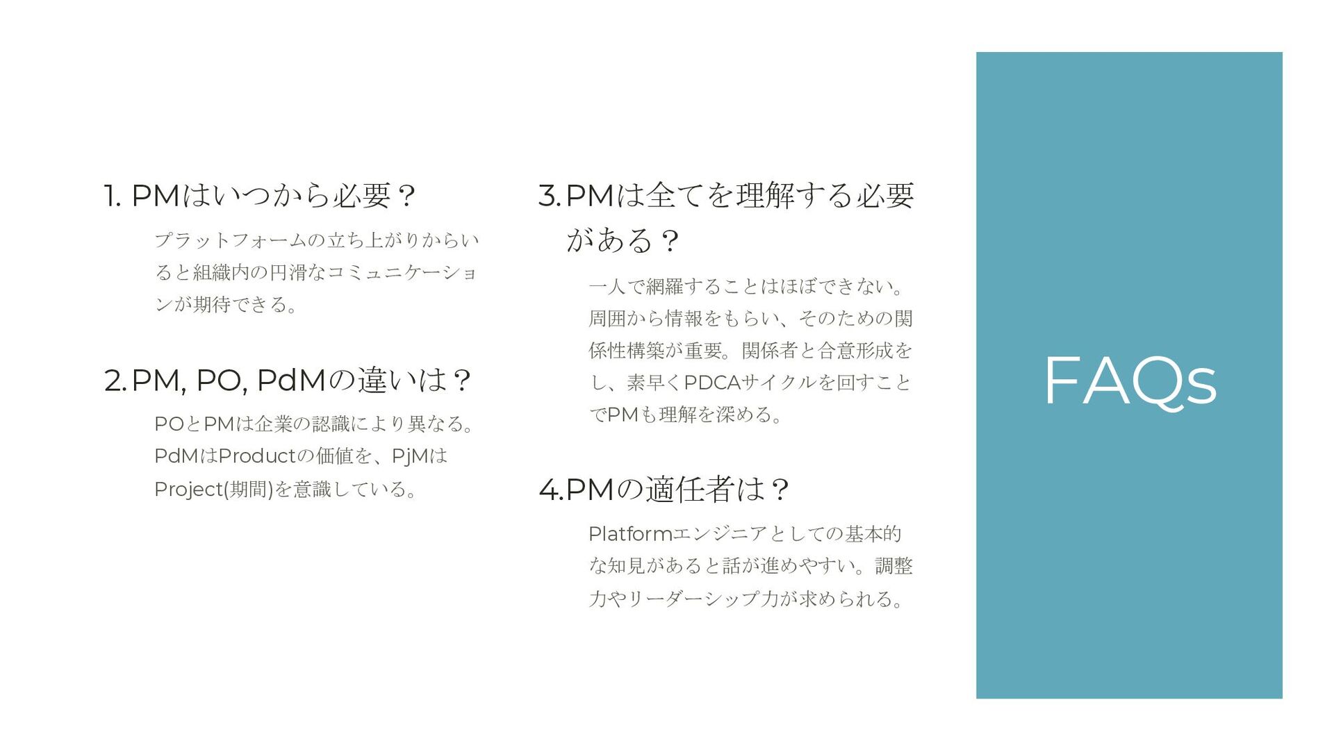 PdMはProductの価値を、PjMは Project(期間)を意識している。 3.PMは全てを理解する必要 がある? 一人で網羅することはほぼできない。 周囲から情報をもらい、そのための関 係性構築が重要。関係者と合意形成を し、素早くPDCAサイクルを回すこと でPMも理解を深める。 4.PMの適任者は? Platformエンジニアとしての基本的 な知見があると話が進めやすい。調整 力やリーダーシップ力が求められる。
