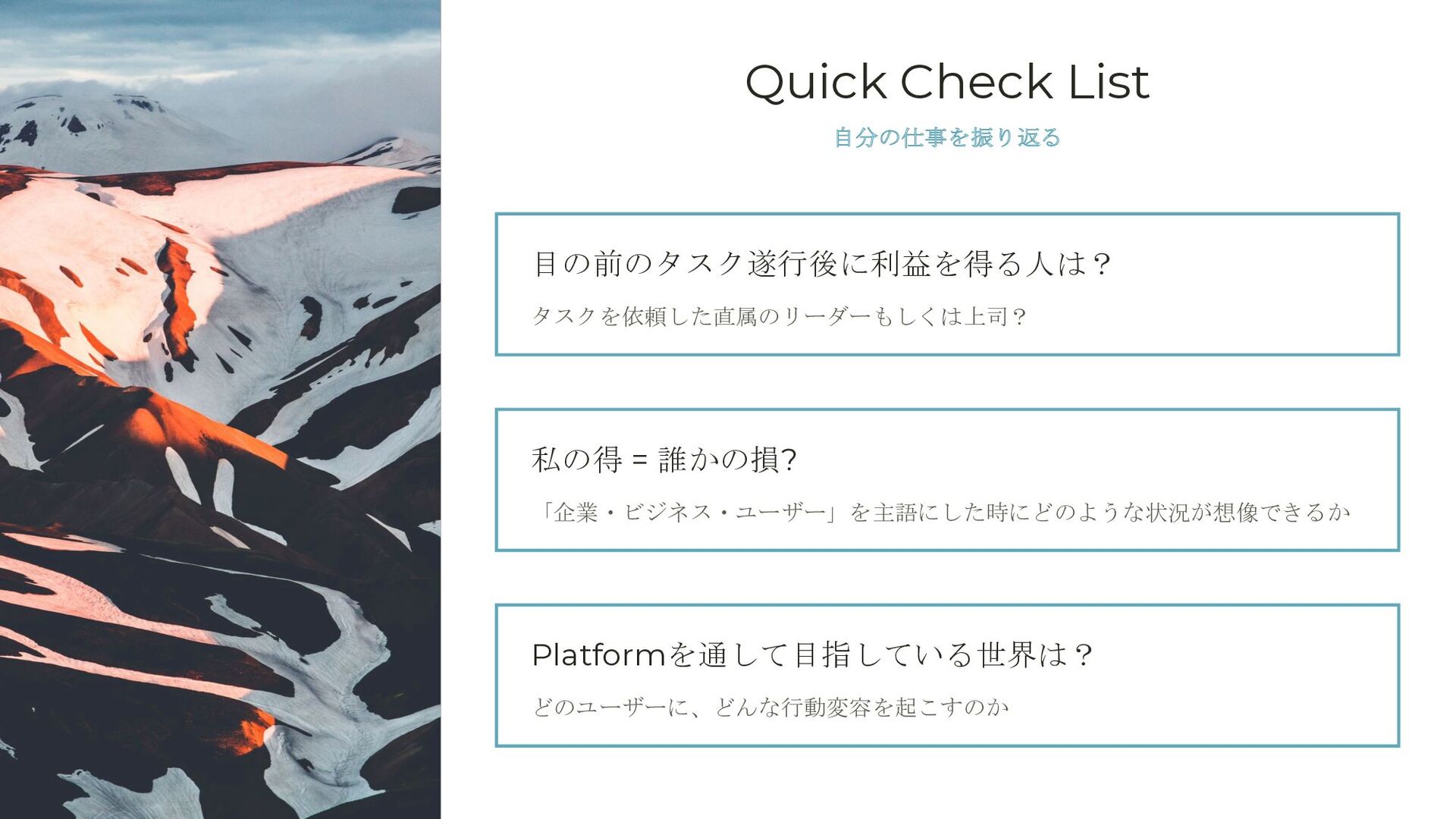 Quick Check List 自分の仕事を振り返る 目の前のタスク遂行後に利益を得る人は? タスクを依頼した直属のリーダーもしくは上司? 私の得 = 誰かの損? 「企業・ビジネス・ユーザー」を主語にした時にどのような状況が想像できるか