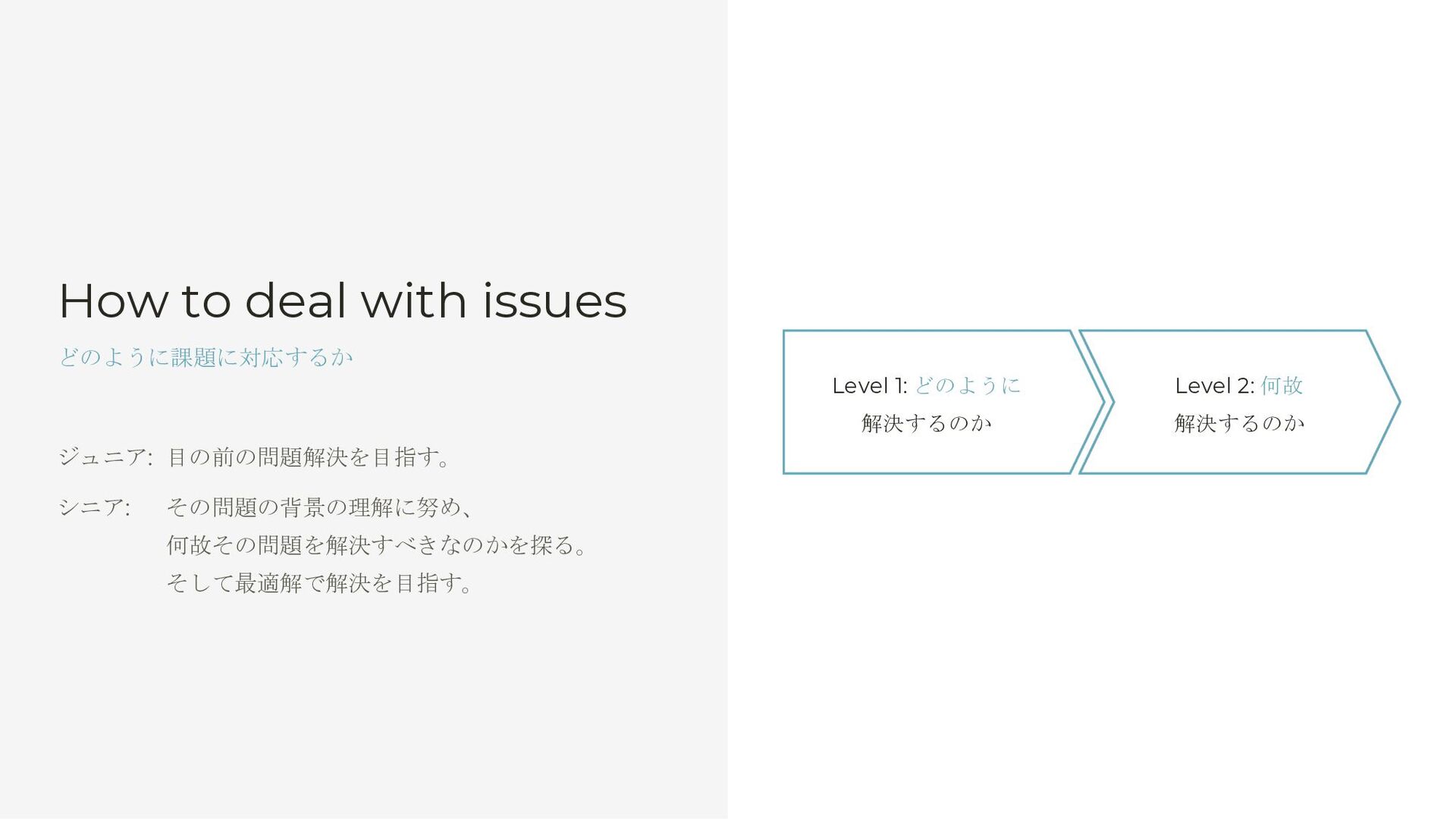 How to deal with issues どのように課題に対応するか ジュニア: 目の前の問題解決を目指す。 シニア: その問題の背景の理解に努め、
