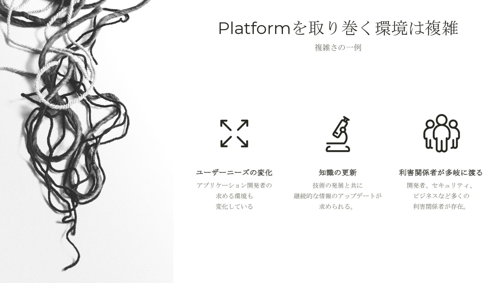 Platformを取り巻く環境は複雑 複雑さの一例 ユーザーニーズの変化 アプリケーション開発者の 求める環境も 変化している 知識の更新 技術の発展と共に 継続的な情報のアップデートが 求められる。