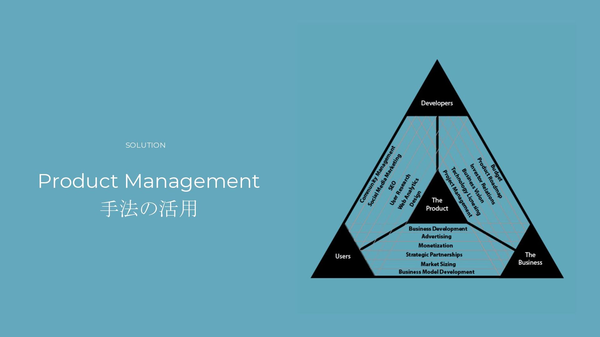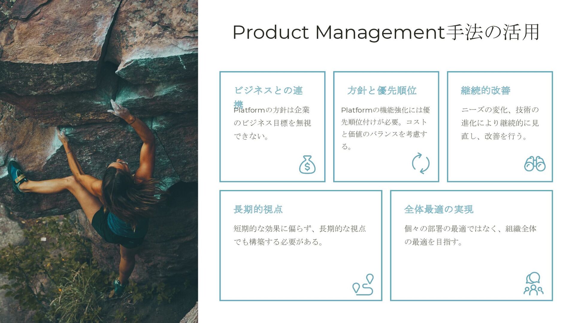 Product Management手法の活用 ビジネスとの連 携 Platformの方針は企業 のビジネス目標を無視 できない。 方針と優先順位 Platformの機能強化には優 先順位付けが必要。コスト