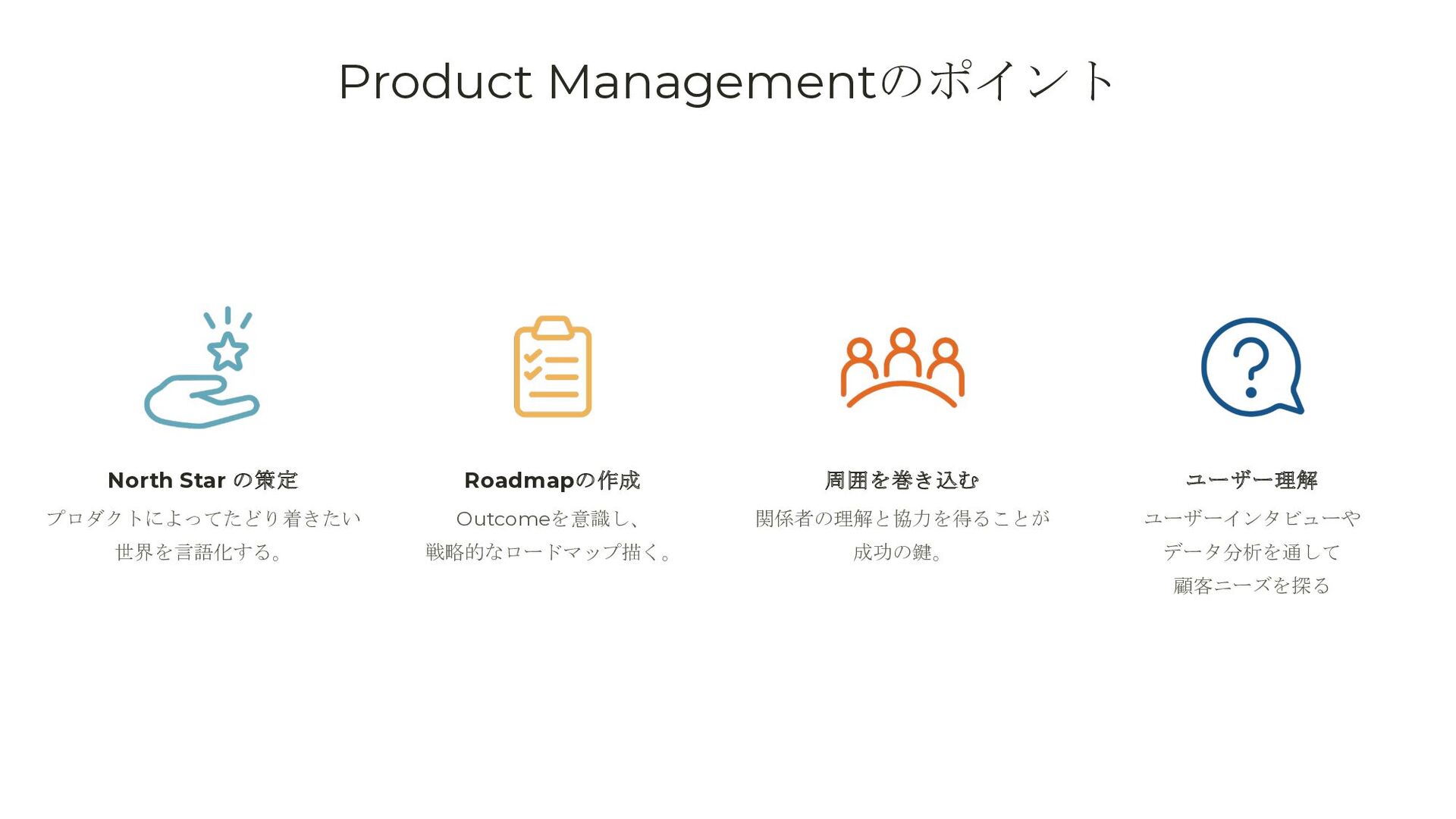 Product Managementのポイント North Star の策定 プロダクトによってたどり着きたい 世界を言語化する。 Roadmapの作成 Outcomeを意識し、 戦略的なロードマップ描く。