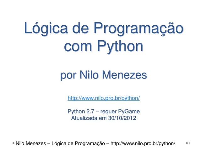 relacionada com a matemática e diversos problemas computacionais. • Uma abordagem gráfica é sugerida para facilitar a introdução aos principais conceitos. 8 Nilo Menezes – Lógica de Programação – http://www.nilo.pro.br/python/