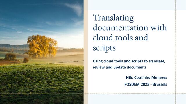It is more or less clear which tools to use when translating the text in the software itself, but not so much for documentation, especially when this documentation evolves and needs to be updated. This talk presents a pipeline to create an initial version converting markdown files and html into po files. Using a script to automatically translate them using the cloud and what to do when the document gets updated.
