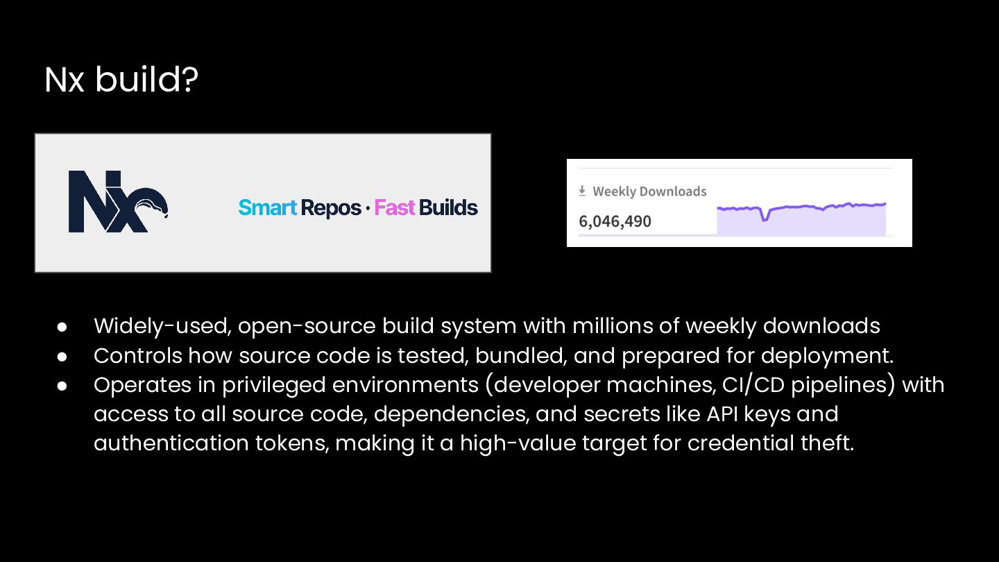weekly downloads • Controls how source code is tested, bundled, and prepared for deployment. • Operates in privileged environments (developer machines, CI/CD pipelines) with access to all source code, dependencies, and secrets like API keys and authentication tokens, making it a high-value target for credential theft.