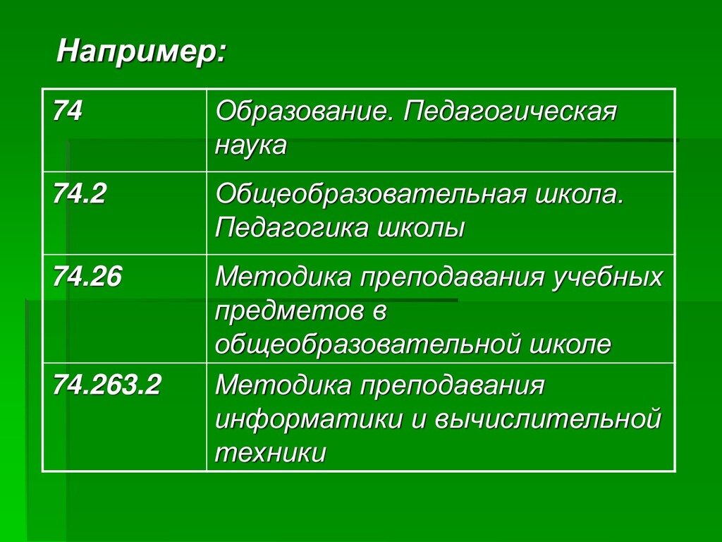 преподавания зоологии 74.262.88 Методика преподавания биологии человека, антропологии 74.263 Методика преподавания труда, общетехнических предметов 74.263.01 Методика преподавания черчения 74.263.2 Методика преподавания информатики и вычислительной техники 74.266 Методика преподавания общественных наук