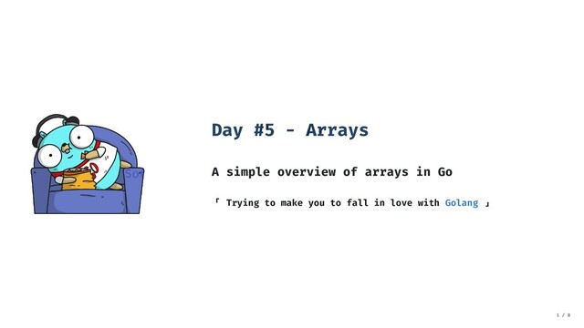 array to a new variable or pass an array to a function, the entire array is copied. any changes to this copied array, won't affect the original array Try It! 「Trying to make you to fall in love with Golang」 - Arrays 7 / 8 Arrays Luca Sepe Software Craftsman, Solution Architect, Trainer https://twitter.com/lucasepe/ https://github.com/lucasepe/ https://lucasepe.it/