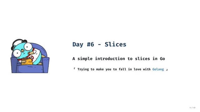 is declared using []T var a []int is created using []T{ el1, el2,...elN} var s = []int{1, 2, 3} s := []int{1, 2, 3} Just like an array but without specifying any size in the brackets [] . Try it! 「Trying to make you to fall in love with Golang」 - Slices 3 / 12 Slices in Go Luca Sepe Software Craftsman, Solution Architect, Trainer https://twitter.com/lucasepe/ https://github.com/lucasepe/ https://lucasepe.it/