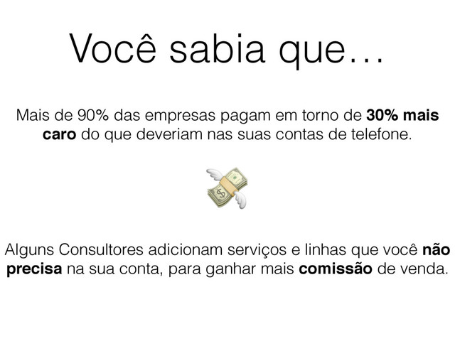mais caro do que deveriam nas suas contas de telefone. Você sabia que… Alguns Consultores adicionam serviços e linhas que você não precisa na sua conta, para ganhar mais comissão de venda.