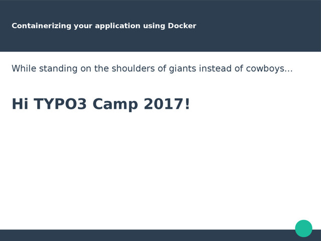 Best practices talk on how to containerize, test and run an application using (Docker) containers. Presented at TYPO3 camp Venlo, the Netherlands. Note that slides are mainly meant as a summary of the talk.