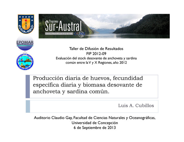 de anchoveta y sardina común. Luis A. Cubillos Taller de Difusión de Resultados FIP 2012-09 Evaluación del stock desovante de anchoveta y sardina común entre la V y X Regiones, año 2012 Auditorio Claudio Gay, Facultad de Ciencias Naturales y Oceanográficas, Universidad de Concepción 6 de Septiembre de 2013