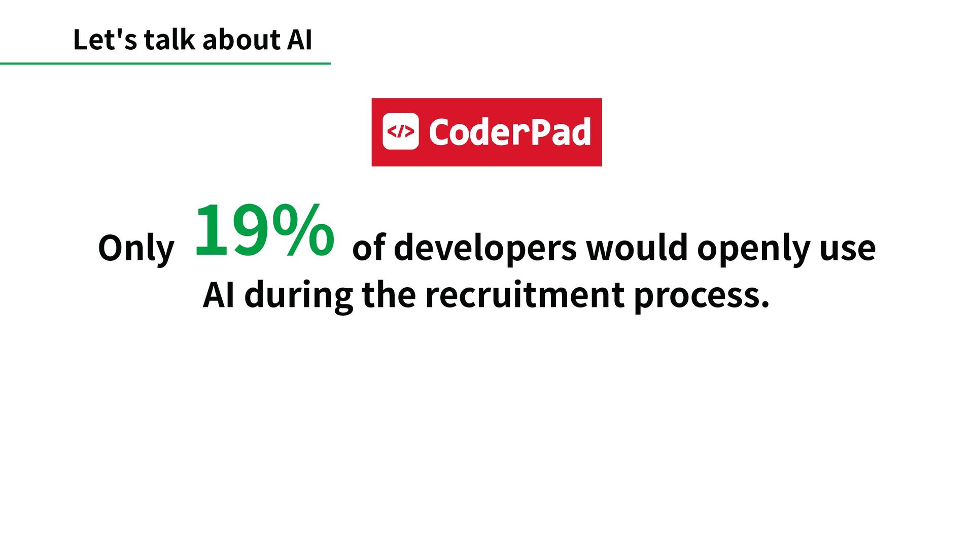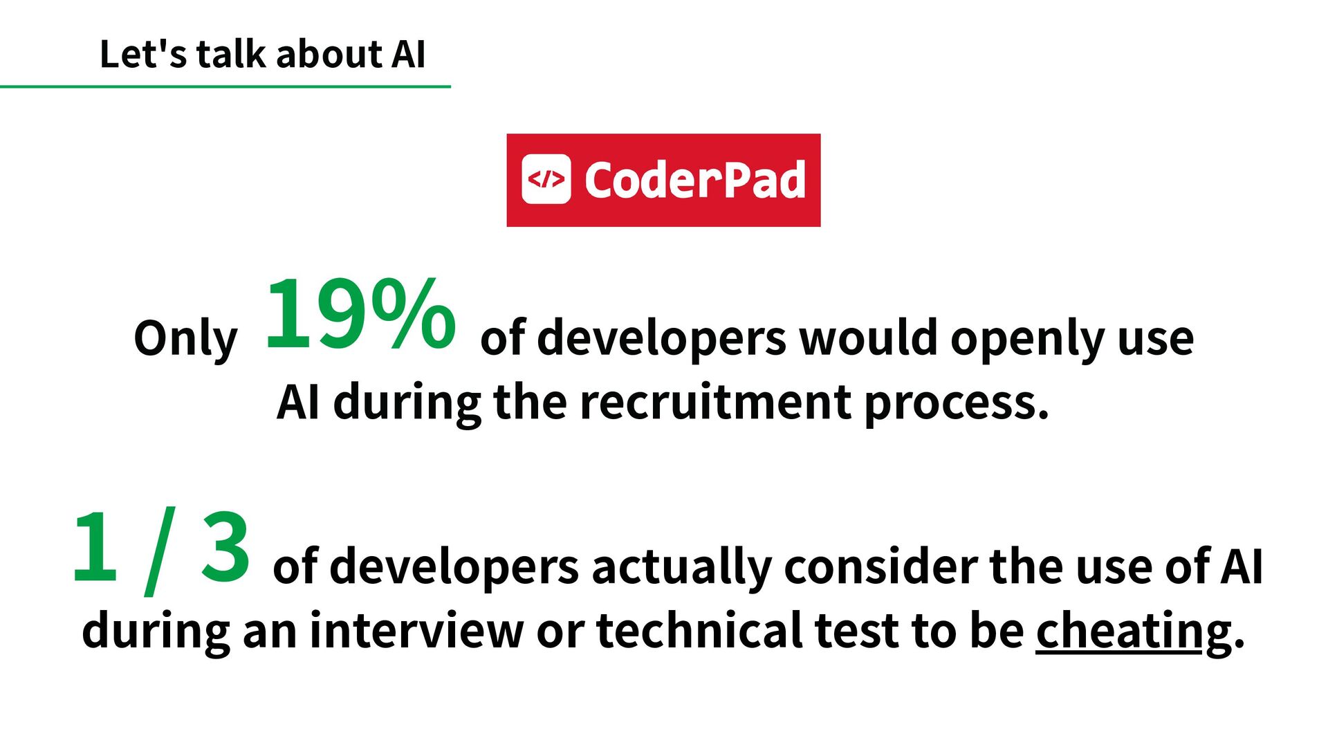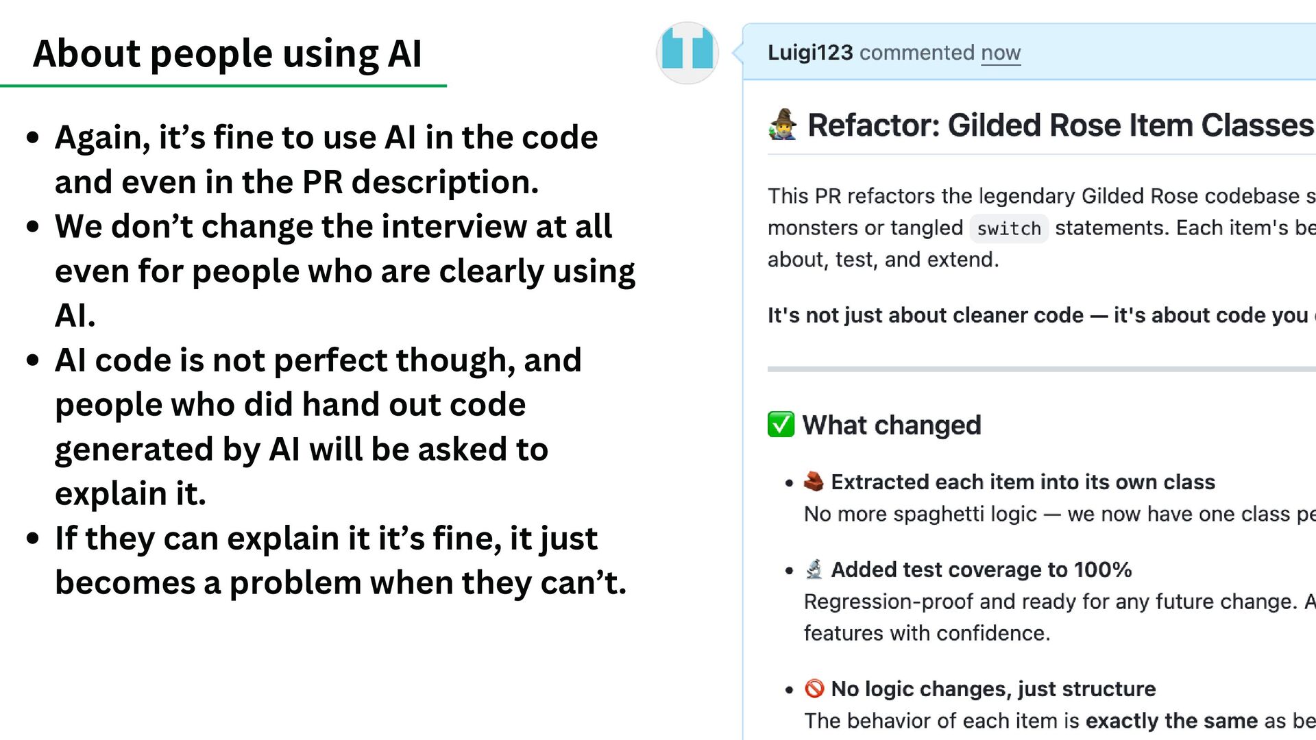 in the code and even in the PR description. We don’t change the interview at all even for people who are clearly using AI. AI code is not perfect though, and people who did hand out code generated by AI will be asked to explain it. If they can explain it it’s fine, it just becomes a problem when they can’t.