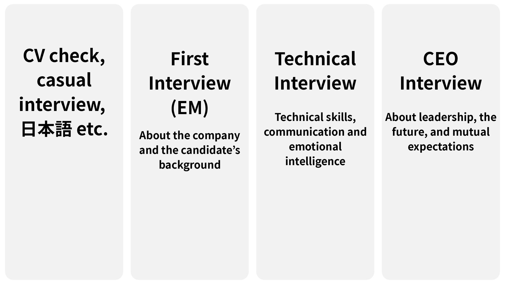 the company and the candidate’s background Technical Interview Technical skills, communication and emotional intelligence CEO Interview About leadership, the future, and mutual expectations