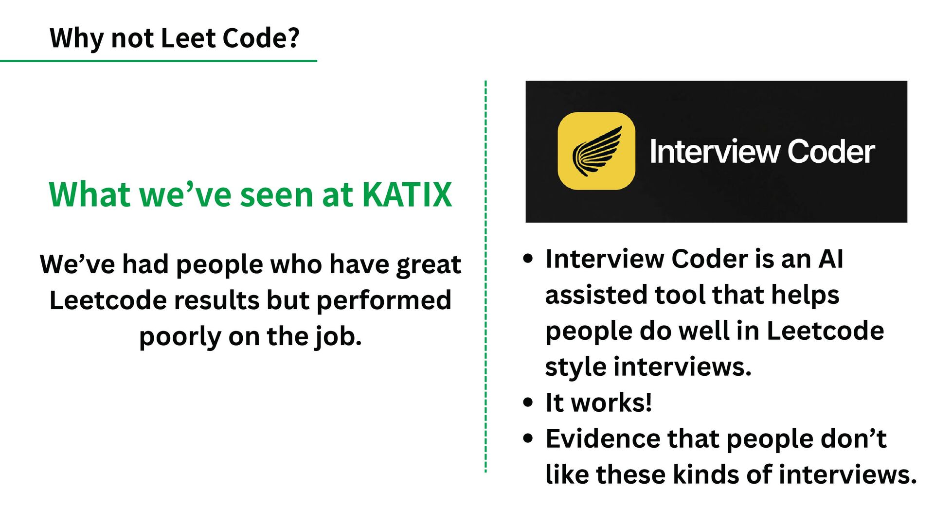 Leetcode results but performed poorly on the job. What we’ve seen at KATIX Interview Coder is an AI assisted tool that helps people do well in Leetcode style interviews. It works! Evidence that people don’t like these kinds of interviews.