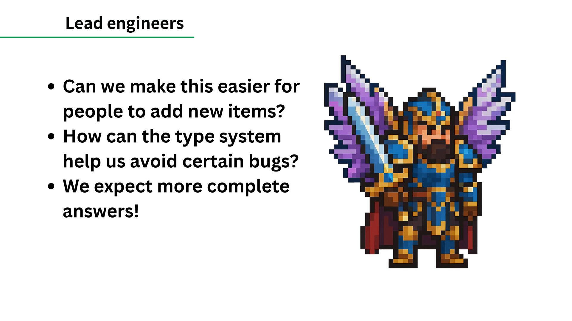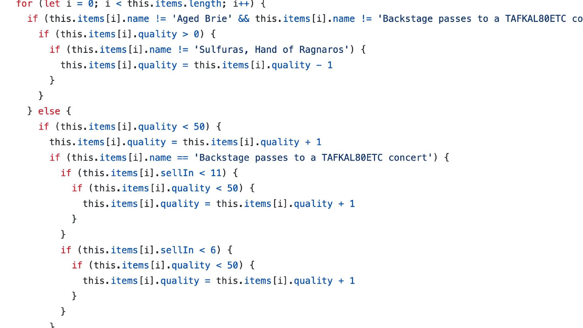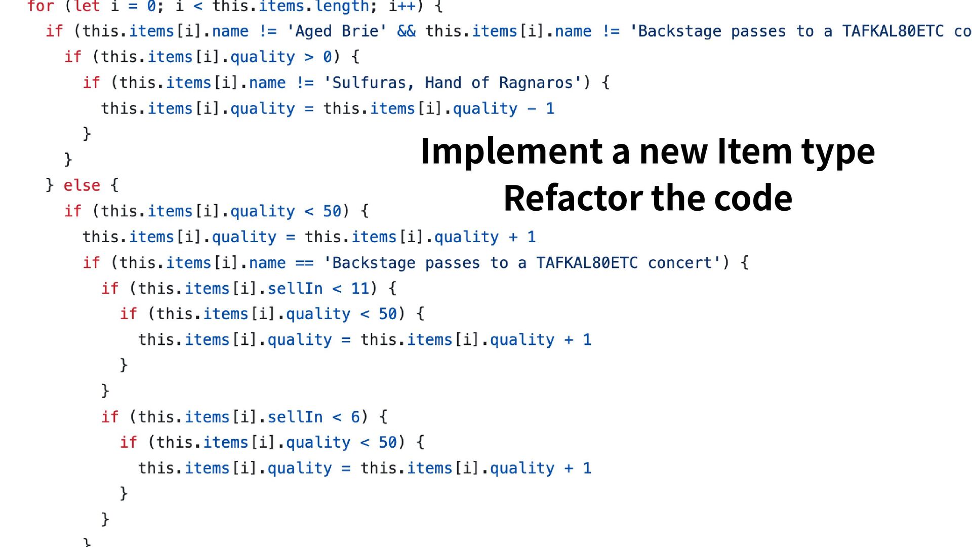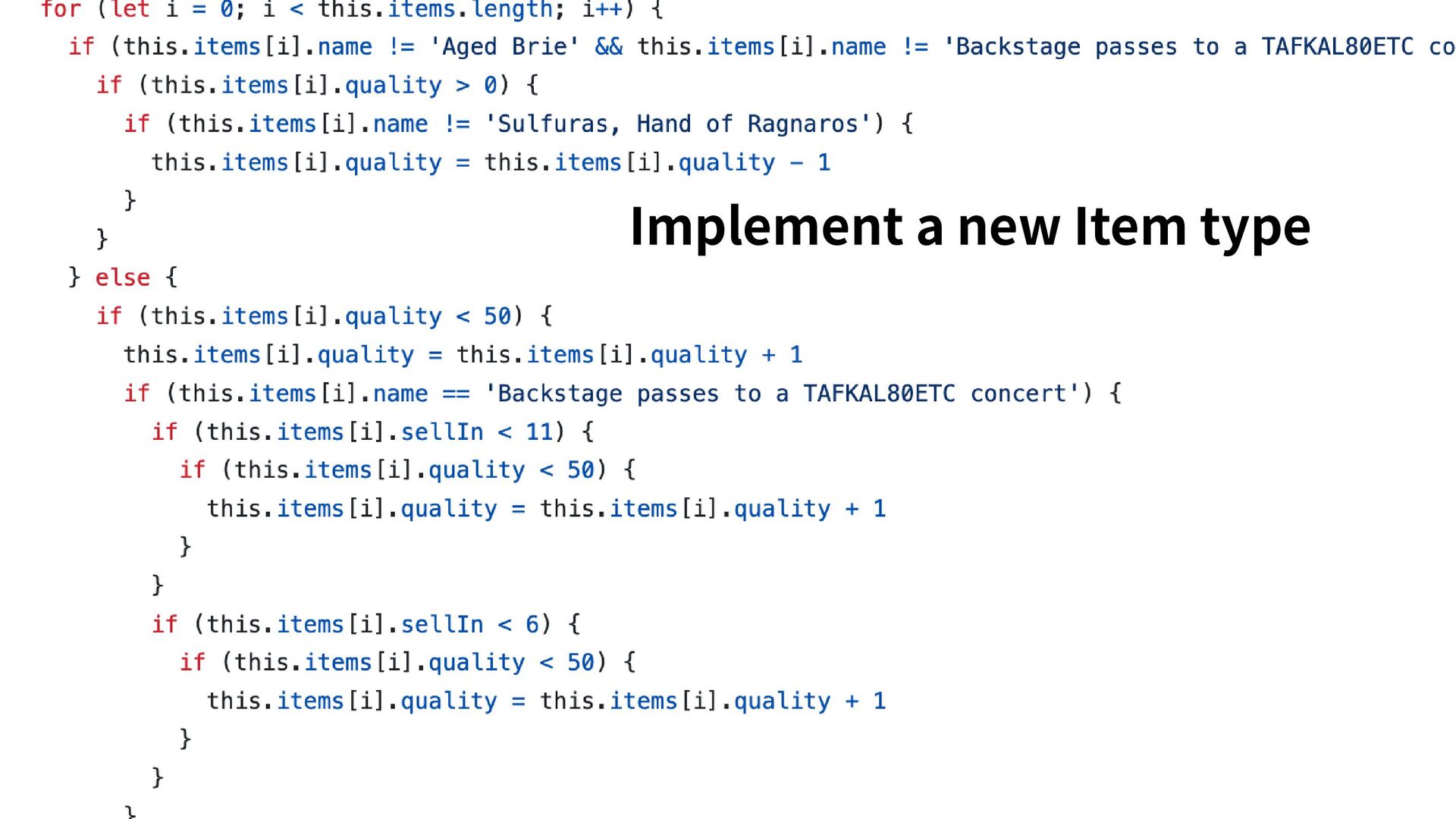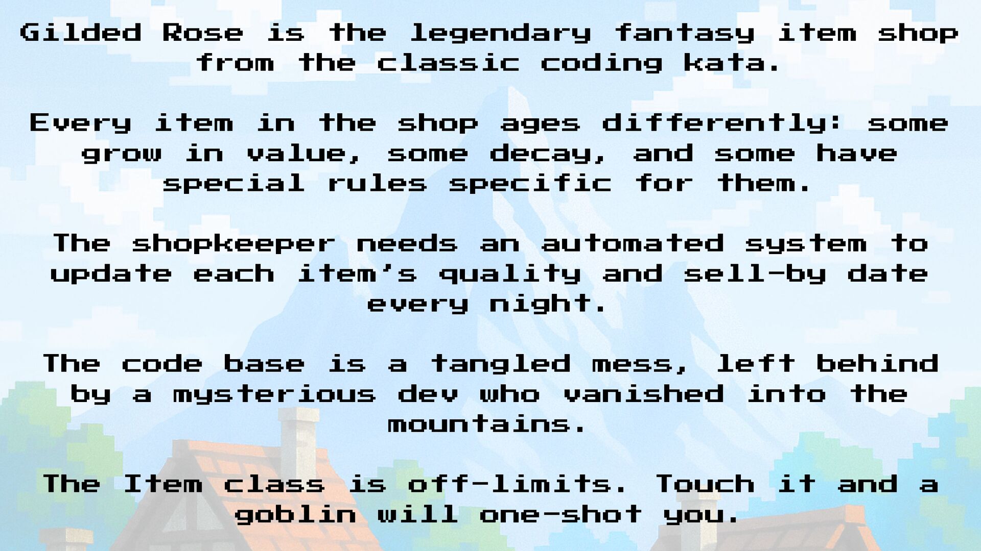 classic coding kata. Every item in the shop ages differently: some grow in value, some decay, and some have special rules specific for them. The shopkeeper needs an automated system to update each item’s quality and sell-by date every night. The code base is a tangled mess, left behind by a mysterious dev who vanished into the mountains. The Item class is off-limits. Touch it and a goblin will one-shot you.