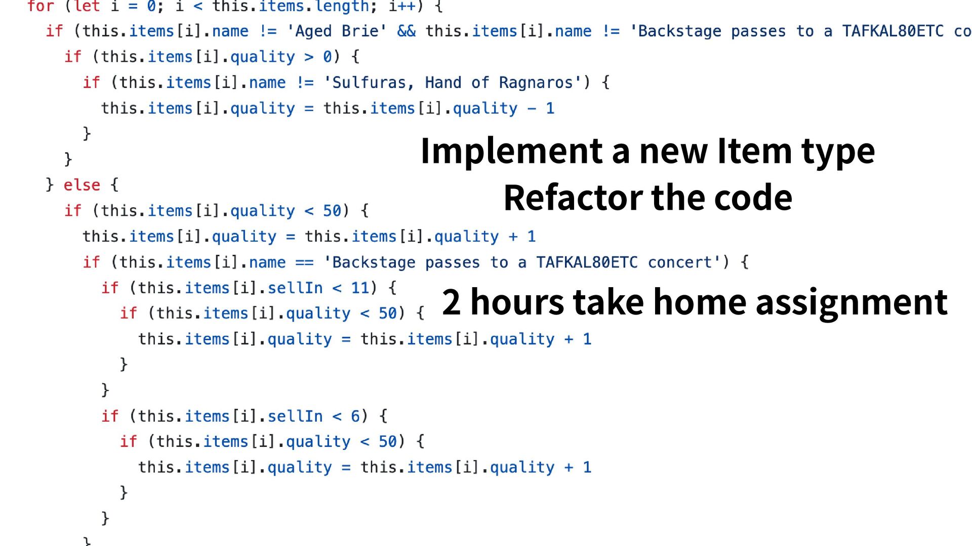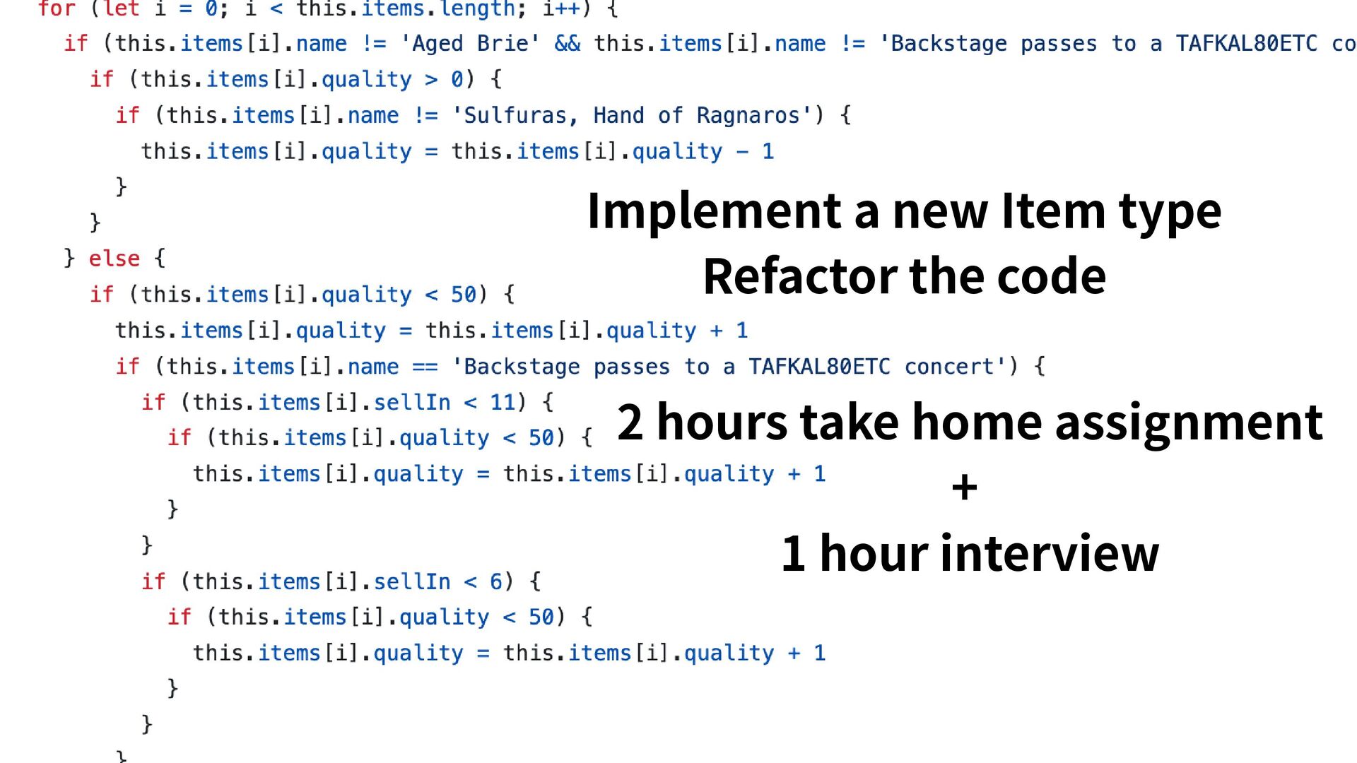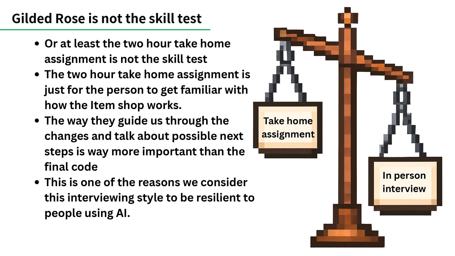 not the skill test The two hour take home assignment is just for the person to get familiar with how the Item shop works. The way they guide us through the changes and talk about possible next steps is way more important than the final code This is one of the reasons we consider this interviewing style to be resilient to people using AI. Gilded Rose is not the skill test Take home assignment In person interview