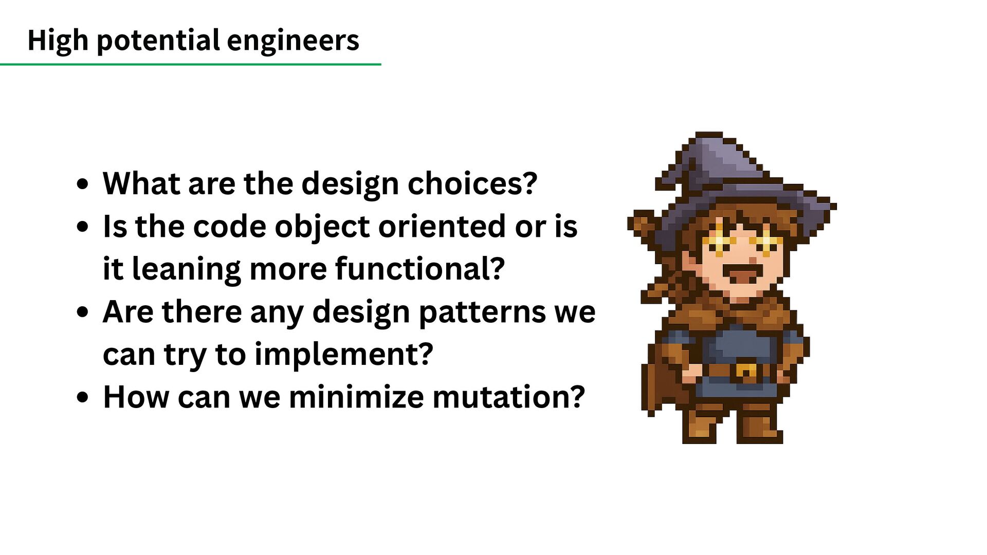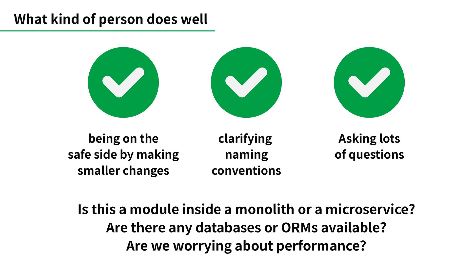 inside a monolith or a microservice? Are there any databases or ORMs available? Are we worrying about performance? being on the safe side by making smaller changes clarifying naming conventions Asking lots of questions