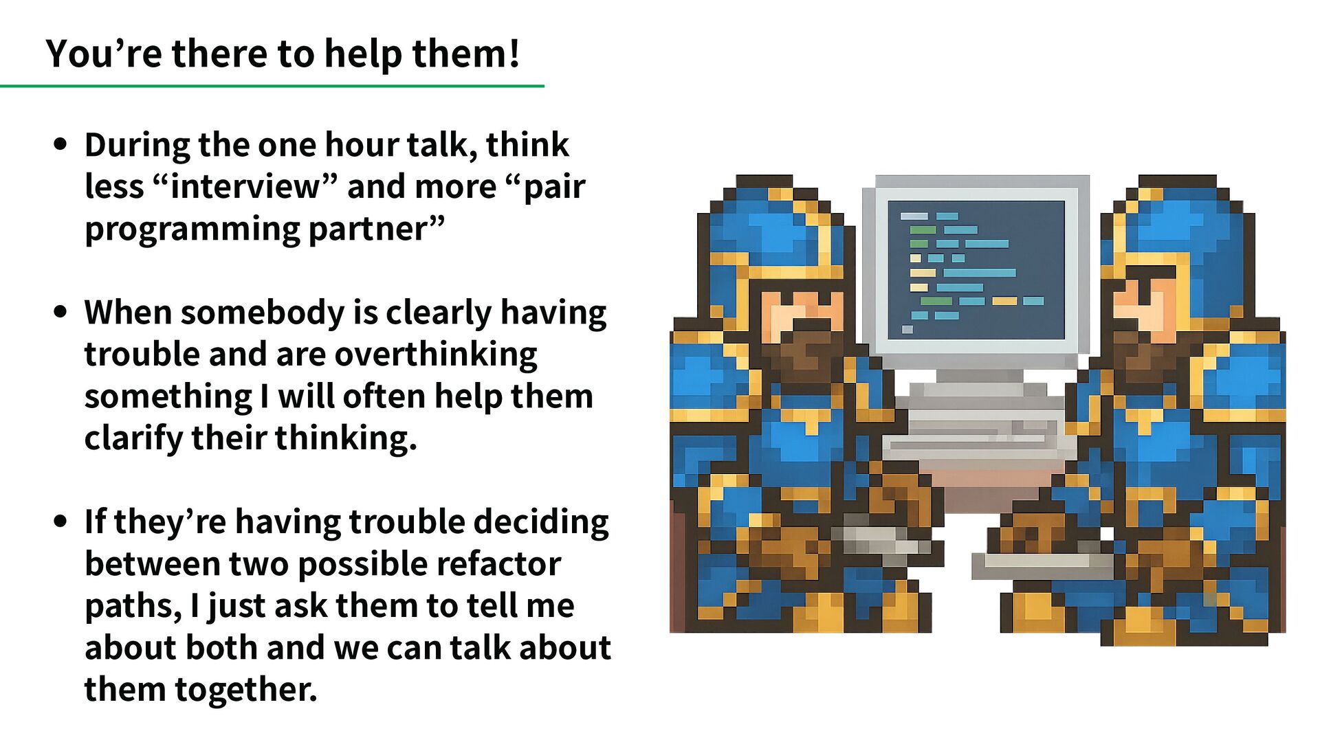 think less “interview” and more “pair programming partner” When somebody is clearly having trouble and are overthinking something I will often help them clarify their thinking. If they’re having trouble deciding between two possible refactor paths, I just ask them to tell me about both and we can talk about them together.