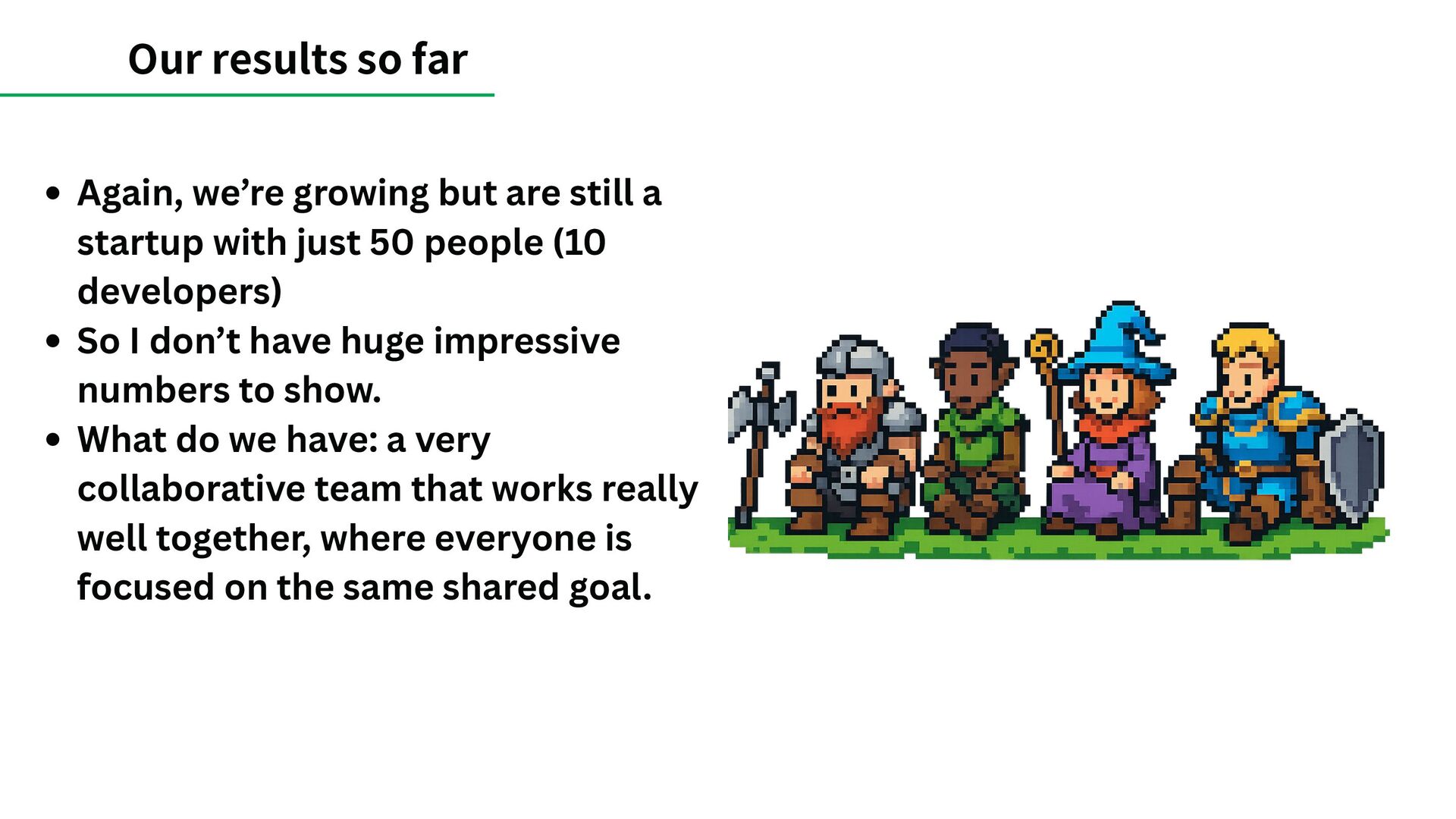 a startup with just 50 people (10 developers) So I don’t have huge impressive numbers to show. What do we have: a very collaborative team that works really well together, where everyone is focused on the same shared goal.