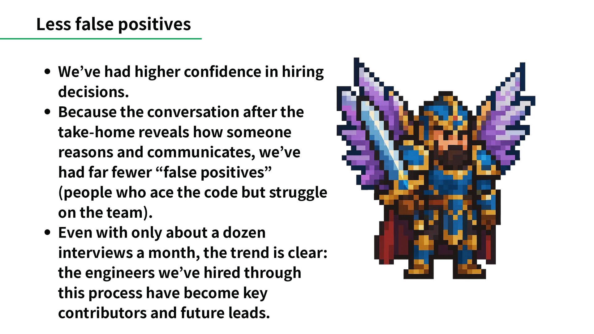 Because the conversation after the take-home reveals how someone reasons and communicates, we’ve had far fewer “false positives” (people who ace the code but struggle on the team). Even with only about a dozen interviews a month, the trend is clear: the engineers we’ve hired through this process have become key contributors and future leads.