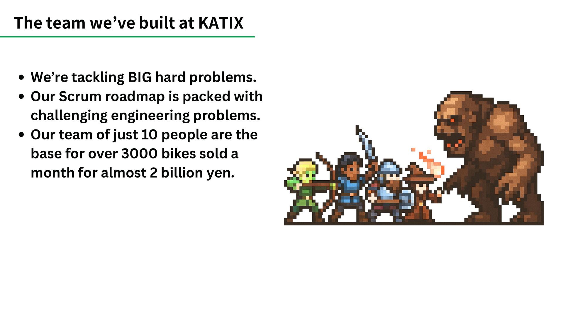 problems. Our Scrum roadmap is packed with challenging engineering problems. Our team of just 10 people are the base for over 3000 bikes sold a month for almost 2 billion yen.