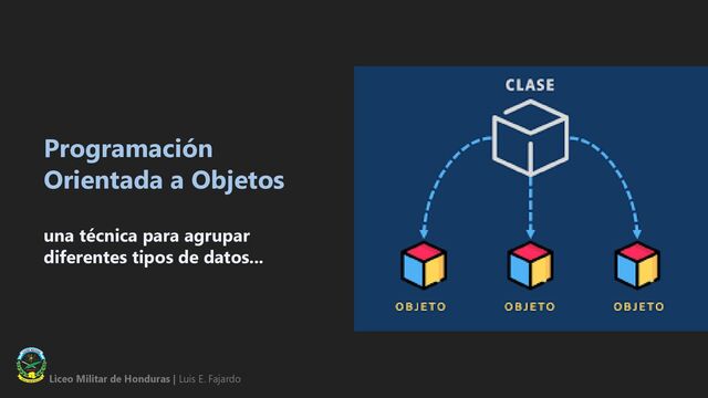 un patrón de datos y encapsular los datos en una sola entidad. Este tipo de programación la entidad puede tener caracteristicas y funciones. Liceo Militar de Honduras | Luis E. Fajardo