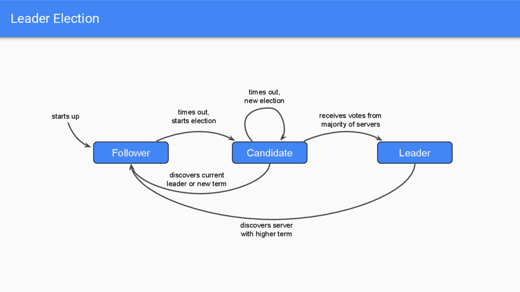 out, new election receives votes from majority of servers discovers current leader or new term discovers server with higher term Leader Election
