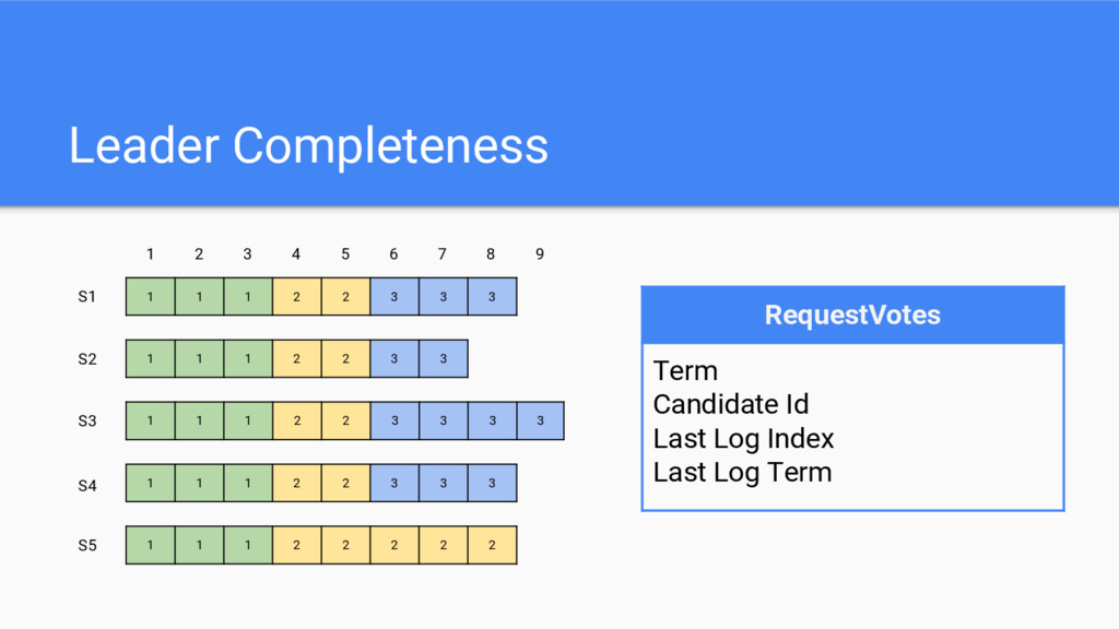 1 1 1 2 2 3 3 1 1 1 2 2 3 3 3 3 1 1 1 2 2 3 3 3 1 1 1 2 2 2 2 2 S1 S2 S3 S4 S5 1 2 3 4 5 6 7 8 9 RequestVotes Term Candidate Id Last Log Index Last Log Term