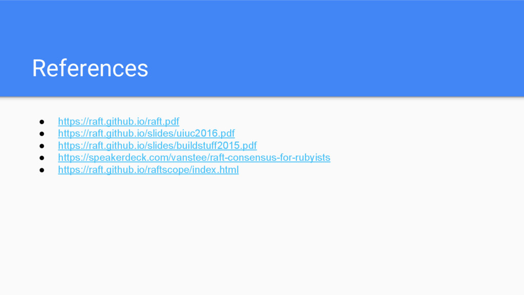 References • https://raft.github.io/raft.pdf • https://raft.github.io/slides/uiuc2016.pdf • https://raft.github.io/slides/buildstuff2015.pdf • https://speakerdeck.com/vanstee/raft-consensus-for-rubyists •