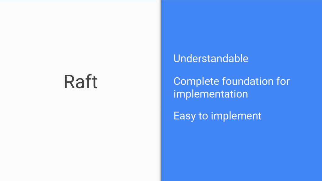 Raft Understandable Complete foundation for implementation Easy to implement