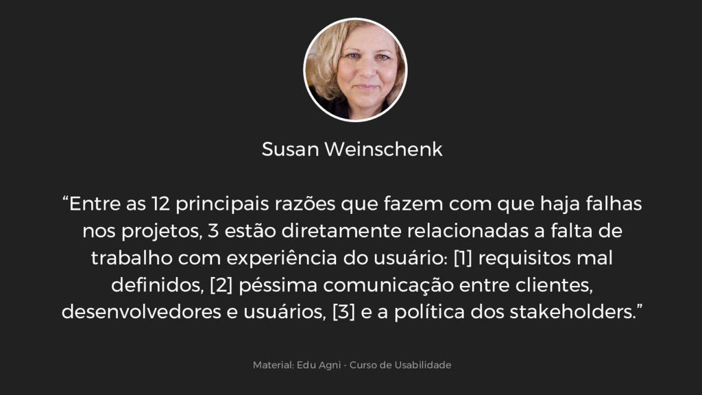 que haja falhas nos projetos, 3 estão diretamente relacionadas a falta de trabalho com experiência do usuário: [1] requisitos mal definidos, [2] péssima comunicação entre clientes, desenvolvedores e usuários, [3] e a política dos stakeholders.” Material: Edu Agni - Curso de Usabilidade
