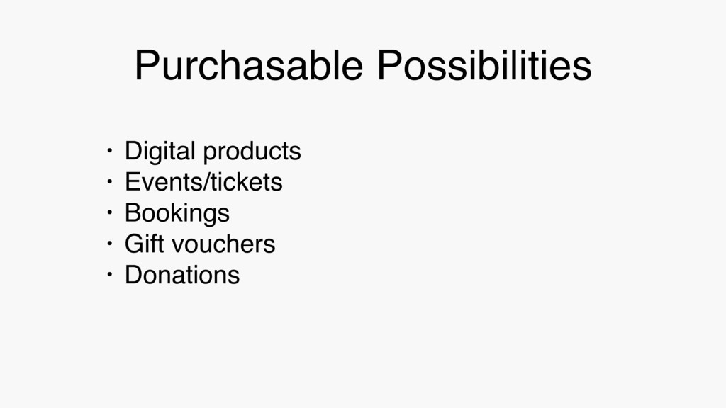 Purchasable Possibilities • Digital products • Events/tickets • Bookings •