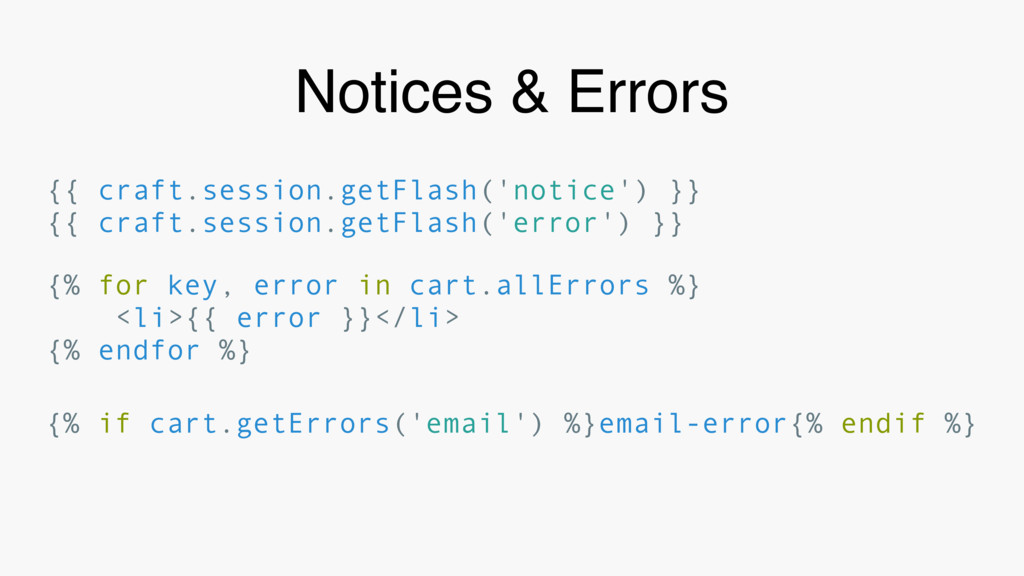 in cart.allErrors %} <li>{{ error }}</li> {% endfor %} {% if cart.getErrors('email') %}email-error{% endif %} Notices & Errors