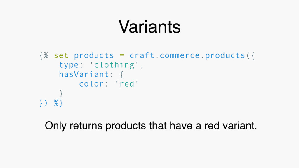 {% set products = craft.commerce.products({ type: 'clothing', hasVariant: { color:
