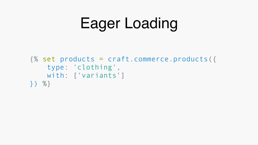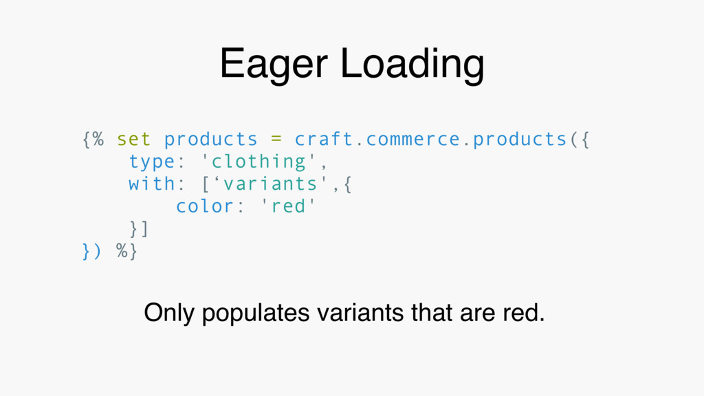 'red' }] }) %} Only populates variants that are red. Eager Loading