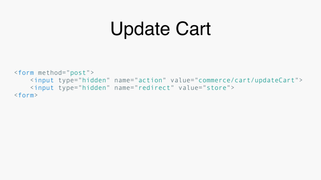 <form method="post"> <input type="hidden" name="action" value="commerce/cart/updateCart"> <input type="hidden" name="redirect" value="store">