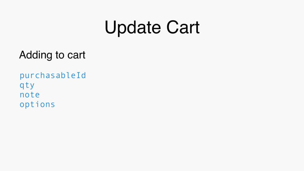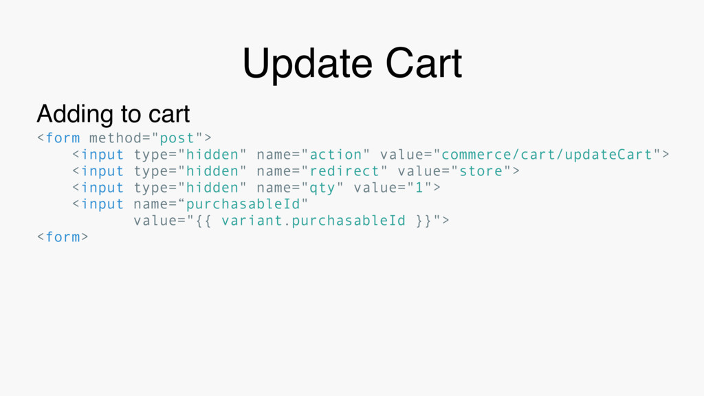 type="hidden" name="redirect" value="store"> <input type="hidden" name="qty" value="1"> <input name=“purchasableId" value="{{ variant.purchasableId }}"> <form> Update Cart