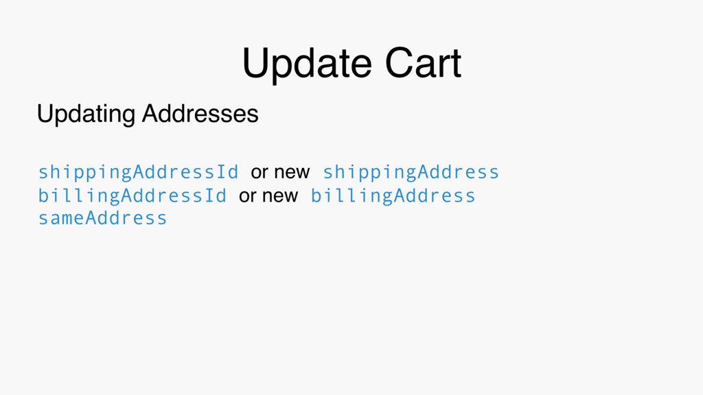 Updating Addresses Update Cart shippingAddressId or new shippingAddress billingAddressId or