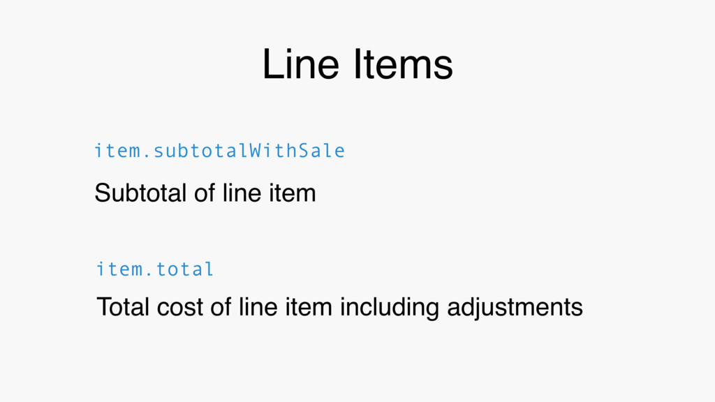 Line Items item.subtotalWithSale Subtotal of line item item.total Total cost