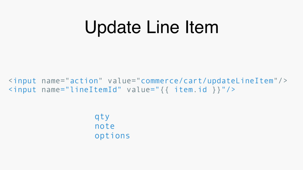 Update Line Item <input name="action" value="commerce/cart/updateLineItem"/> <input name="lineItemId" value="{{ item.id