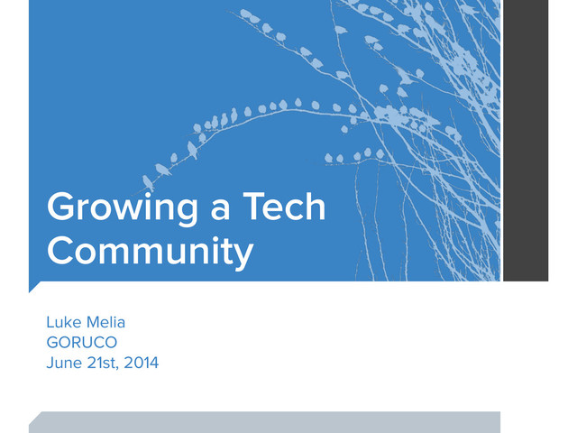 10 tips for people growing a local tech community based on my experiences with the Ember.js NYC group. This was a 10-minute presented at GORUCO 2014. You may want to watch the video (http://vimeo.com/101020270) -- the slides don't cover all the material that I covered verbally.