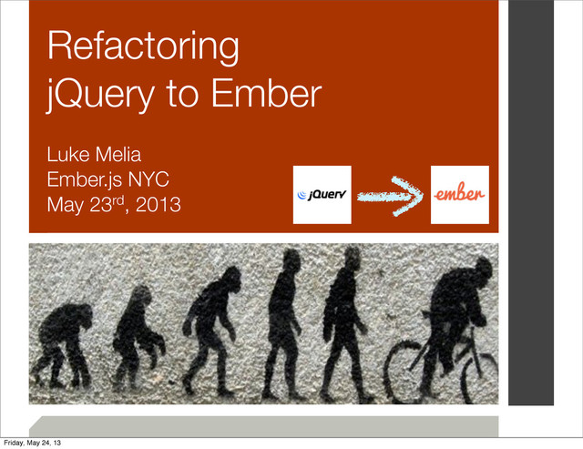template 3. Call the jQuery plugin from didInsertElement 4. Convert jQuery event handlers to view event handlers or action helpers 5. Move library functions into the view file’s closure 6. Refactor library functions to methods on the view and extract instance variables 7. Replace global $() calls with this.$() calls 8. Extract properties 9. Move non-DOM properties and methods to the controller 25 Recap: 9 Rewarding Steps Friday, May 24, 13